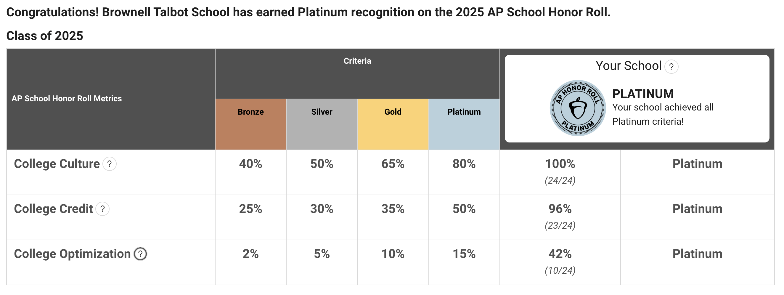 Brownell Talbot has been named to the 2025 AP School Honor Roll as a PLATINUM member! The AP School Honor Roll recognizes schools whose AP program are delivering results and broadening participation for students. Brownell Talbot offers 23 AP courses. 100% of the Class of 2025 took at least one AP course during high school with 88% of students in AP courses earning a score of 3 or higher.